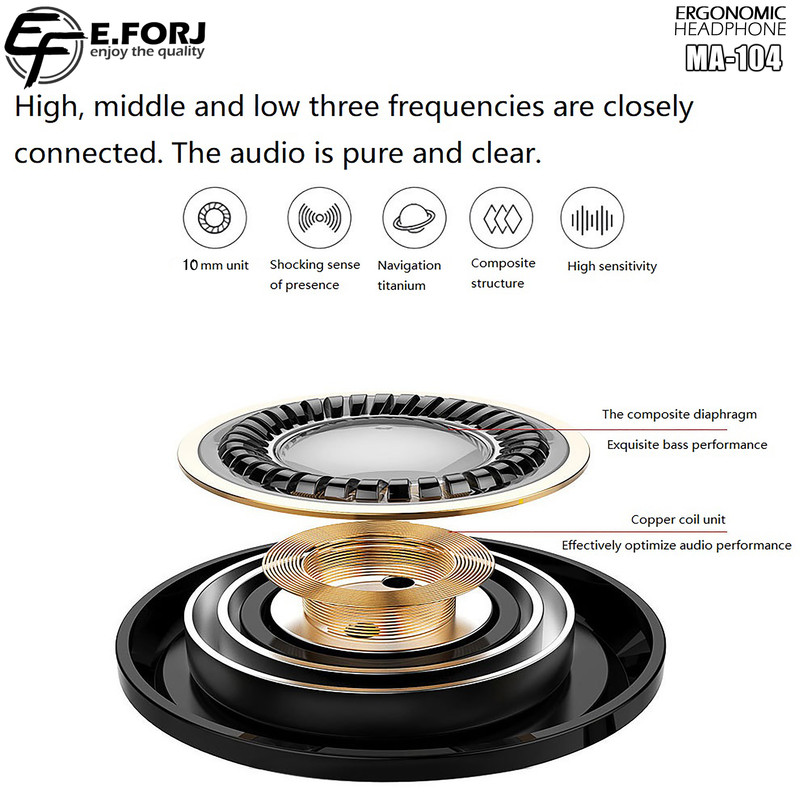 کابل TPE مقاوم در برابر گره خوردن و کشیدگی ، پشتیبانی از صداهای زیر و بم و همچنین بیس عالی این هندزفری از ویژگی هایی است که هر کاربری به آن نیاز دارد . اما تفاوت بارز این هندزفری با مدل های مشابه تمرکز تولید کننده در بهبود صدا و مقاومت این هندزفری در برابر آسیب های احتمالی است . قطعی هندزفری از قسمت جک 3.5 میلی متری و همچنین ناحیه متصل به بلندگوها امری شایع است که در این هندزفری تلاش بر این بوده تا این نواقص برطرف شود . با هندزفری MA-104 ایفورج علاوه بر زیبایی از کیفیت هم بهره مند خواهید شد .
