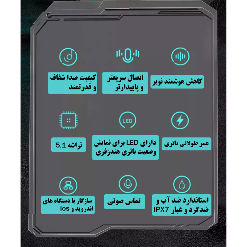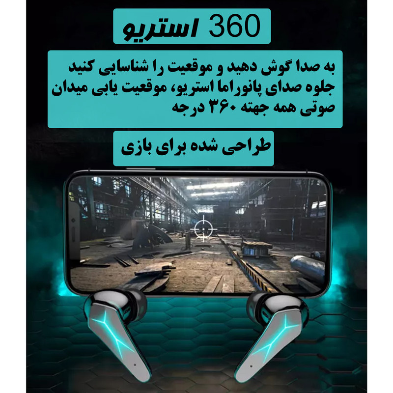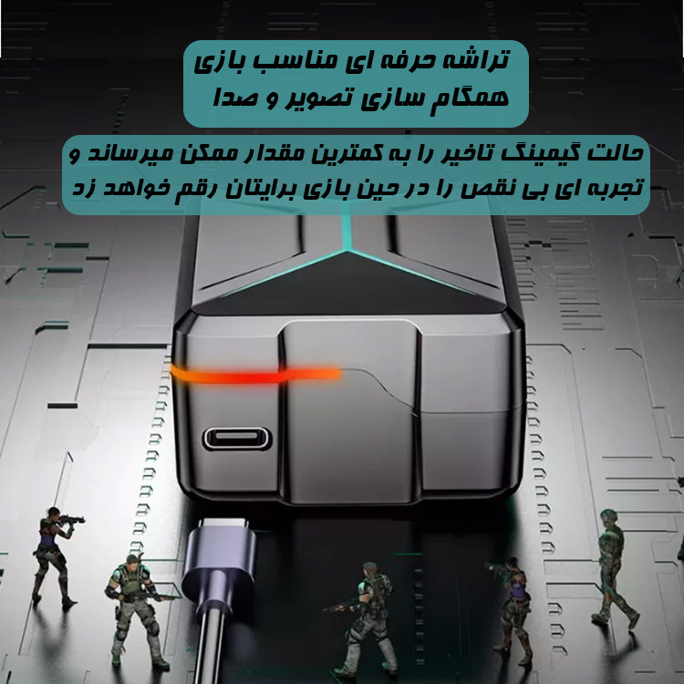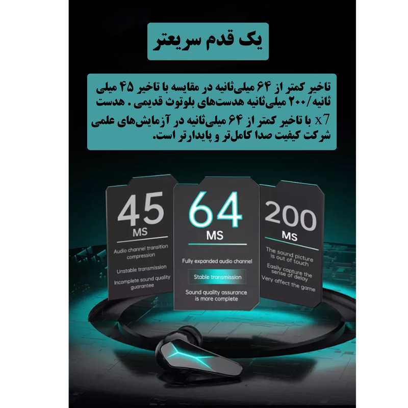 تاخیر کمتر از 64 میلی ثانیه دارای نمایشگر باتری کیفیت مکالمه ی صوتی و تصویری دیافراگم 13 میلی متری صدای 360 درجه استریو دارای طراحی کاملا ارگونومیک و سازگار با گوش انسان مناسب برای بازی های (CALL OF DUTY-PUBG-PES-FIFA و سایر بازی های موبایلی و انلاین)