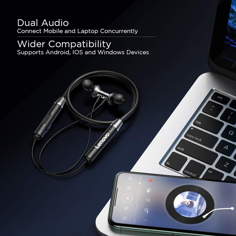 هندزفری بلوتوثی لنوو مدل HE05 TU-Bass یکی از هدفونهای بیسیم این کمپانی است که نسخه بروز شده و با کیفیت تر از سری بسیار محبوب HE05 میباشد .بخش گردنی این محصول با استفاده از پلاستیک مقاوم ABS ساخته شده است که بهکارگیری متریال پلاستیک علاوه بر مقاومت، وزن این هندزفری بیسیم را نیز تا حد زیادی کاهش داده است. مواد بکار برده شده در ساخت هندزفری لنوو HE05 TU-Bass به علت اینکه در تماس مستقیم با پوست هستند، ضد حساسیتاند و هیچ مشکلی را در استفاده طولانیمدت بروز نمیدهند .از ویژگیهای متمایز کننده این هندزفری نسبت به نسخه قدیمی HE05 میتوان به Bass عمیق، ارگونومی عالی، طول عمر باتری بالا، برقراری مکالمه HD و میکروفن مجهز به سیستم هوشمند حذف نویز اشاره کرد. دیافراگم کامپوزیت فیبرکربن + فن آوری صوتی بزرگ سیم پیچ متحرک تحت عمل مغناطیس و الکتریسیته، کیفیت صدای تکان دهنده موسیقی با فرکانس بالا ، متوسط و پایین را با قابلیت اطمینان بالا بازیابی میکند .کپسول این هندزفری از آلیاژ آلمونیوم ساخته شده و همین امر آن را در برابر ضربه و فشار مقاوم میسازد. دو سر هندزفری لنوو دارای آهنربا است که باعث می شود در صورت عدم استفاده و رها کردن هندزفری دور گردن این دوسر به هم متصل شده و مانند گردنبند کاملا با ثبات دور گردن شما قرار بگیرد. این هدست بلوتوث لنوو دارای تراشه بلوتوثی نسخه 5.0 است که از طریق آن به گوشی، تبلت و یا لپ تاپ متصل می شود. تراشه بلوتوثی 5.0، مصرف انرژی کمی دارد و بر بی سیم آن تا 10 متر می رسد. این چیپست بلوتوث، اتصالی پایدار و با ثبات و تماسی بدون اختلال را تضمین می کند.هدست بلوتوث لنوو HE05 TU-Bass دارای استاندارد محافظت IPX5 بوده و در برابر رطوبت و گرد و غبار از مقاومت بالایی برخوردار است.طراحی هندزفری بلوتوث دورگردنی لنوو بسیار ارگونومیک و مطابق طرح گوش بوده و به واسطه وزن کم ایربادز ها، در استفاده طولانی مدت کاربر را اذیت نخواهد کرد.کابل اتصال دو ایربادز به هم از جنس TPE بوده و بسیار انعطاف پذیر می باشد همچنین سری های ایربادز نیز از سیلیکا ژل و ضدحساسیت ساخته شده است. باتری 105 میلی آمپرساعت درون این هدست به کار رفته است که با یکبار شارژ کامل ، 8 ساعت پخش مداوم موسیقی را تضمین می کند. همچنین 120 ساعت در حالت آماده به کار خواهد بود.