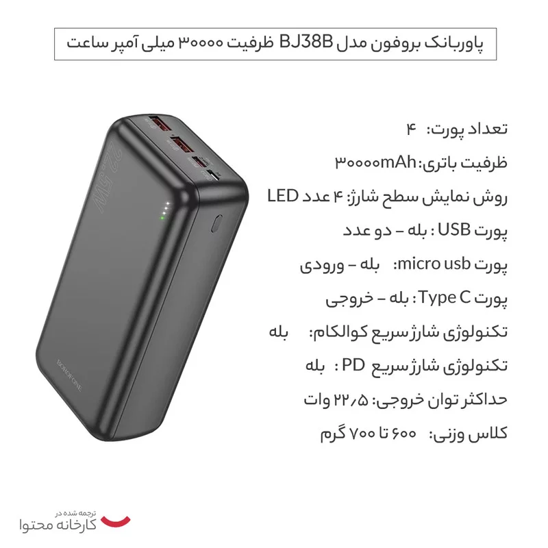 ابعاد: میلیمتر نوع پاوربانک (شارژر همراه): پاوربانک نوع باتری پاوربانک: لیتیوم پلیمری کلاس وزنی: سنگین|بیشتر از 400 گرم نحوه نمایش میزان شارژ باتری: نشانگر LED ظرفیت اسمی: 30000 تعداد درگاه خروجی: سه عدد قابلیتهای ویژه: تکنولوژی Quick Charge 3.0 , فناوری USB PD 3.0 محدوده ظرفیت: 30 تا 60 هزار میلیآمپرساعت توضیحات جنس بدنه: ABS + PC شدت جریان خروجی: 3.0 آمپر ولتاژ خروجی: 5.0 ولت ولتاژ ورودی: 5 ولت سازگار با: تمام دستگاه های هوشمند امکانات و قابلیتها: قابلیت حمل در هواپیما دارای گواهینامه QC PASS جهت تایید بررسی و آزمونهای کیفیت سنج دارای تمام استانداردهای بینالمللی وزن: 601 گرم رنگ: مشکی