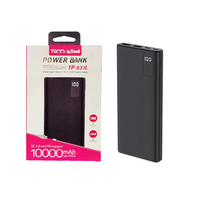 شارژر همراه تسکو مدل TP 831L ظرفیت 10000 میلی آمپر ساعت یک پاوربانک بسیار قدرتمند با مشخصات فنی کامل و طراحی بسیار زیبا دارد. در بالای پاوربانک در قسمت سمت راست دارای LED برای نشاندادن میزان شارژ در آن کار گذاشتهشده است. شارژر همراه تسکو مدل TP 831L ، میتواند مدت طولانی کاربر را از شارژ بینیاز سازد. در این پاوربانک 4 درگاه وجود دارد که دو عدد از آنها USB 2.0، یکی دیگر USB-C و دیگری microUSB هستند. USB-C و microUSB در این پاوربانک برای شارژ شدن خود شارژر همراه با ولتاژ 5 و 2 آمپر است.