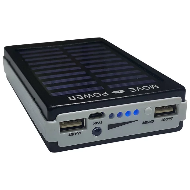 پاور بانک های خورشیدی از پر طرفدارترین محصولات سولار است زیرا میتوان آن را در سفر یا مناطق دور از برق آن را با نور خورشید یا نور لامپ های عادی شارژ نمود .باید ذکر نمود به دلیل کوچک بودن صفحه توان شارژ خورشیدی آن پایین بوده و حدود 0.1 وات می باشد که البته به نسبت اتصال به برق زمان بسیار طولانی تری برای شارژ نیازمند است. این محصول دارای یک صفحه LED قوی و بزرگ با 20 ال ای دی است که در سه حالت عادی ،چشمک زن عادی و چشمک زن سریع SOS میتواند نور قابل ملاحضه ای در اختیار شما قرار دهد . در پنل جلو دارای یک LED آبی است که میتوان برای تشخیص اسکناس اصلی استفاده نمود. چراغ نشانگر آن در حالت عادی جهت نمایش درصد شارژ و در حالت شارژ برقی یا شارژ خورشیدی نشانگر شروع شارژ می باشد . با دوخروجی usb با جریان 1 و 2 آمپر میتوان از دو خروجی جهت شارژ گوشی یا تبلت استفاده کرد
