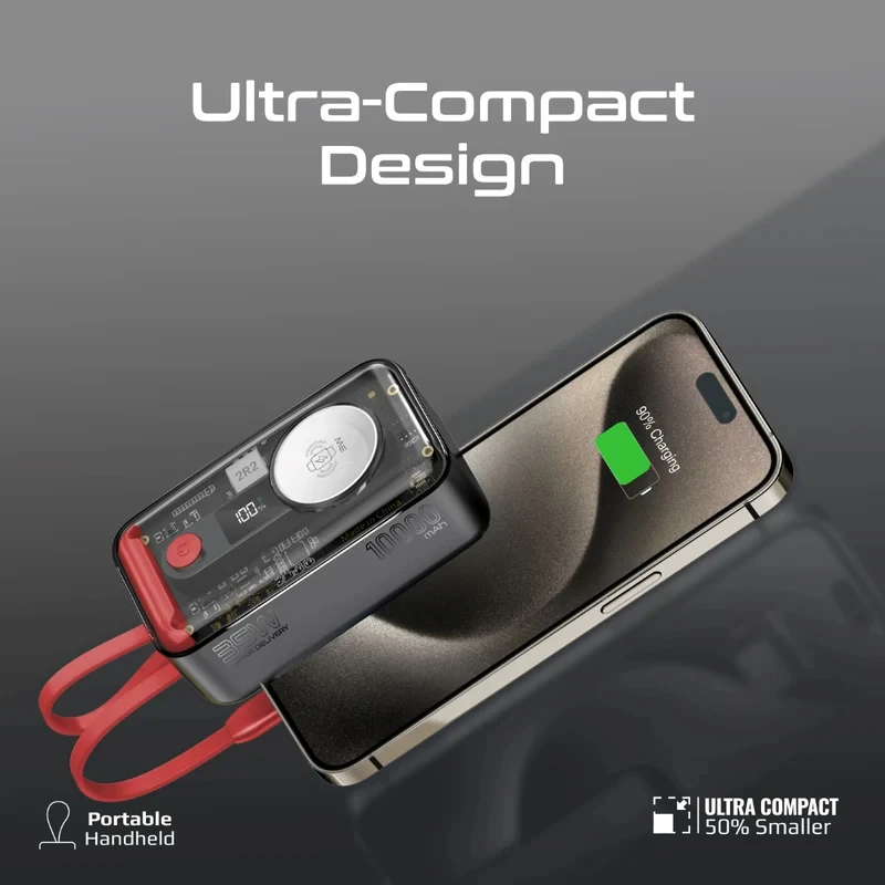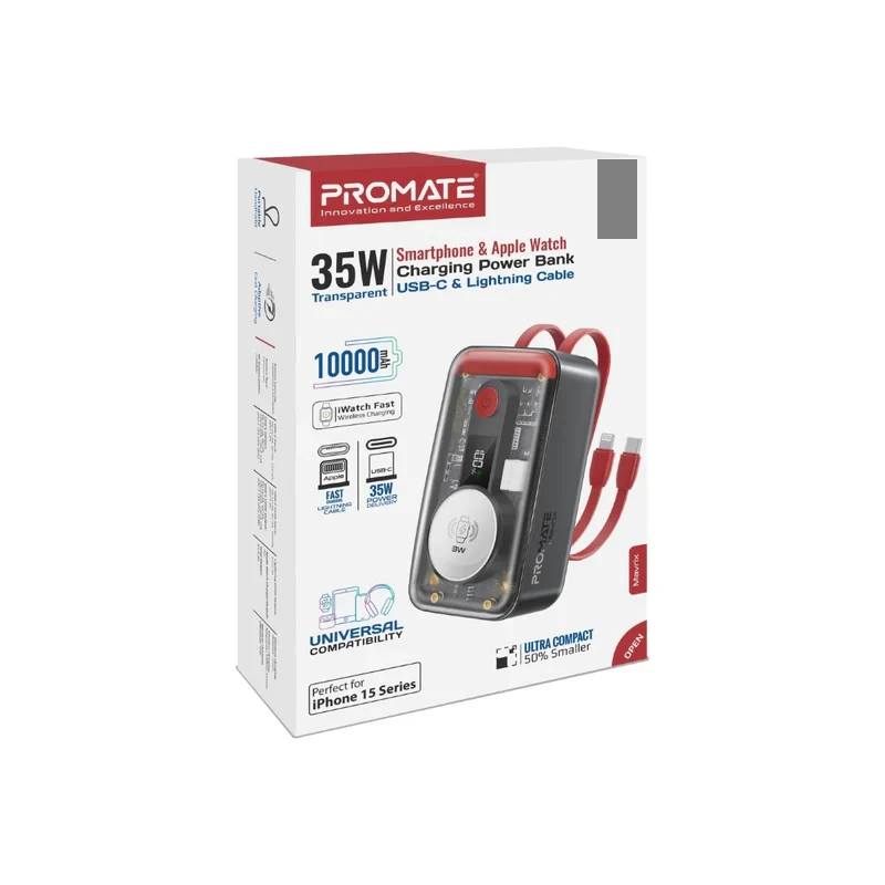 یکی از ویژگیهای برجسته این پاوربانک، قابلیت شارژ بیسیم ۳ وات برای ساعت اپل است. همچنین، دارای کابلهای داخلی USB-C و لایتنینگ است که نیاز به حمل کابلهای اضافی را از بین میبرد.