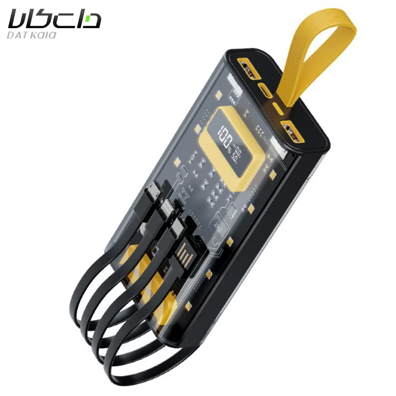 2 پورت خروجی USB و 1 پورت خروجی تایپ سی، 4 عدد کابل سرخود تایپ سی، یو اس بی، میکرو و لایتنینگ