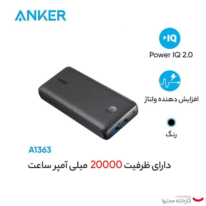 پاوربانک «A1363» تولید شرکت «انکر» از یک باتری لیتیومی با ظرفیت 20000 میلیآمپر ساعت بهره میبرد. این پاوربانک 386 گرم وزن دارد. با داشتن این پاوربانک دیگر بابت تمامشدن شارژ باتری گوشی موبایل، تبلت، دوربین دیجیتال و لوازمی از این قبیل نگرانی نخواهید داشت؛ زیرا میتوانید در هر شرایطی بدون نیاز به پریز برق، باتری گوشی موبایل یا دیگر لوازم سازگار با این محصول را تنها با استفاده از یک کابل USB شارژ کنید. در ساخت A1363 از تکنولوژی شارژ سریع Quick Charge 3.0 استفاده شده است. همچنین این تکنولوژی در پورت ورودی هم وجود دارد تا زمان شارژشدن A1363 سریعتر باشد. پشتیبانی از شارژ سریع به این معنی است که باتری دستگاه شما با کمک این پاوربانک سریعتر از شارژرهای معمولی شارژ خواهد شد. البته باید توجه داشته باشید که تکنولوژی شارژ سریع تنها با دستگاههای دارای استاندارد شارژ سریع سازگار است و در دستگاههای معمولی امکان استفاده از این تکنولوژی وجود ندارد. شدت جریان خروجی در این شارژر همراه با توجه به ولتاژ خروجی آن، متفاوت است. زمانی که ولتاژ خروجی در این محصول 5 تا 6 ولت باشد، شدت جریان خروجی 3 آمپر است. این در حالی است که اگر ولتاژ خروجی در این محصول 6 تا 9 ولت باشد، شدت جریان خروجی برابر با 2 آمپر خواهد بود. در حالت سوم و زمانی که ولتاژ خروجی 9 تا 12 ولت باشد، شدت جریان خروجی برابر با 1.5 آمپر است. در مورد شدت جریان ورودی این محصول نیز باید بدانید که اگر در حالت عادی ولتاژ ورودی در آن 5 ولت باشد، شدت جریان ورودی2 آمپر خواهد بود و در حالت شارژ سریع (5V ⎓ 2.1A / 7-9V ⎓ 1.6A / 9-12V ⎓1.25A) است. شما میتوانید وضعیت شارژ باتری A1363را از طریق نشانگرهای LED روی بدنه بررسی کنید؛ بهطوریکه هر نشانگر LED نشاندهندهی شارژ 10درصدی آن است و در صورت نیاز باید آن را با استفاده از یک کابل USB شارژ کنید. بدنهی این محصول دربرابر خطوخش مقاوم است؛ بنابراین هنگام استفاده از این محصول و قراردادن آن روی سطوح مختلف مشکلی پیش نخواهد آمد. همچنین این محصول از تکنولوژی منحصربهفرد مولتی پروتکت (MultiProtect) برای محافظت گوشی شما در مقابل انواع خطرات الکترونیکی مانند ولتاژ بالا و جریان بالا و اتصال جریان بهره میبرد.