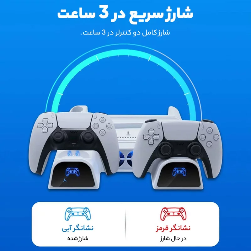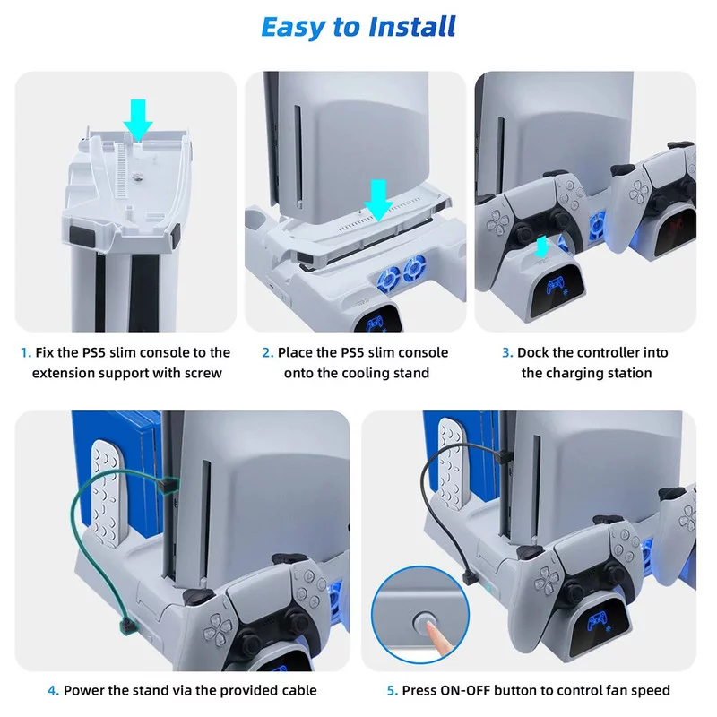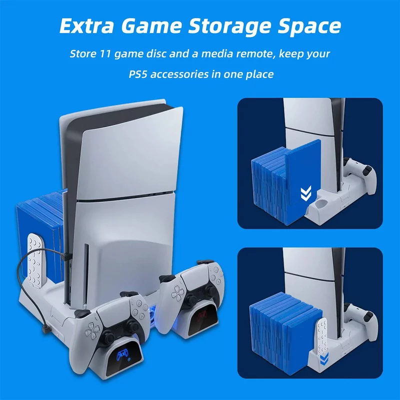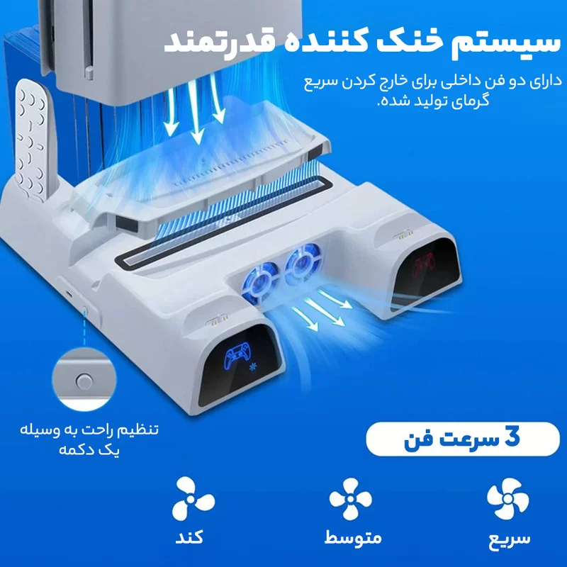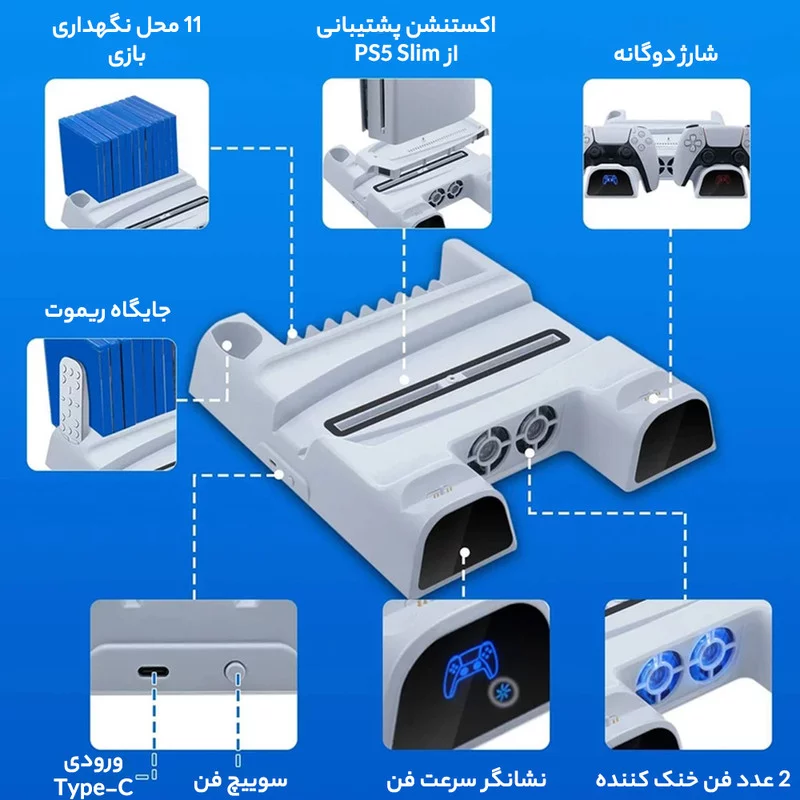 پایه خنک کننده و شارژ چندکاره Dobe مخصوص پلی استیشن 5 و پلی استیشن 5 اسلیم، شما را از هر وسیله جانبی دیگری بینیاز میکند. این پایه دارای یک قاب مخصوص برای پلی استیشن 5 اسلیم است و با هر چهار مدل پلی استیشن 5 کاملا سازگاری دارد. این پایه دارای دو کانکتور USB-C مخصوص دوال سنس برای شارژ همزمان دو گیم پد است و همچنین دارای 11 فضای مخصوص دیسک بازیها است. این پایه با یک کابل USB-C به پلی استیشن یا هر منبع برقی متصل میشود و علاوه بر یک پورت USB دارای یک کابل USB دوگانه برای اتصال لوازم جانبی بیشتر به کنسول است.این محصول همچنین دارای دو فن است که با خنک کردن محیط اطراف کنسول، دمای مناسبی را برای استفاده از پلی استیشن 5 فراهم میکنند.