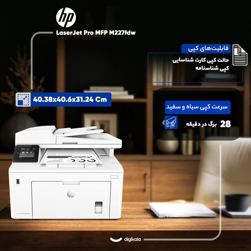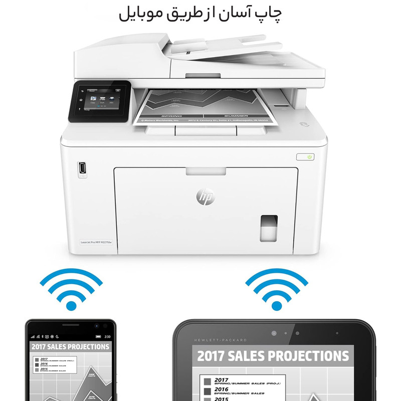 دارای فناوریهای ارتباطی با مشخصات WiFi 4 (802.11b/g/n) و USB 2.0 و 10/100 Ethernet / پشتیبانی از پروتکلهای TCP/IP، IPv4 و IPv6 / پشتیبانی از وایفای دایرکت / ظرفیت سینی خروجی 150 برگه / حداکثر ابعاد کاغذ مورد پشتیبانی 8.5 در 14 اینچ / نرمافزارهای موبایل مورد پشتیبانی HP ePrint و Apple AirPrint و Mopria Print Service / حداکثر توان مصرفی 475 وات / دمای عملیاتی 17.5 تا 25 درجه سانتیگراد / میزان نویز 66 دسی بل (حالت فعال)
