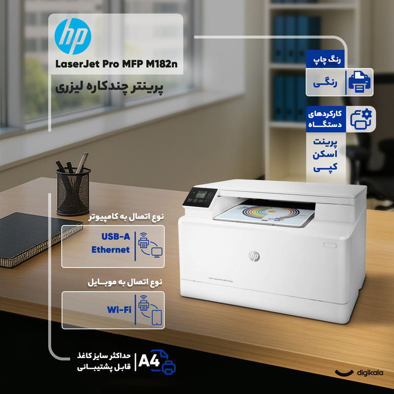 پرینتر لیزری چندکاره رنگی اچ پی مدل Color LaserJet Pro MFP M182n با اتصال باسیم و بیسیم، سایز چاپ A4