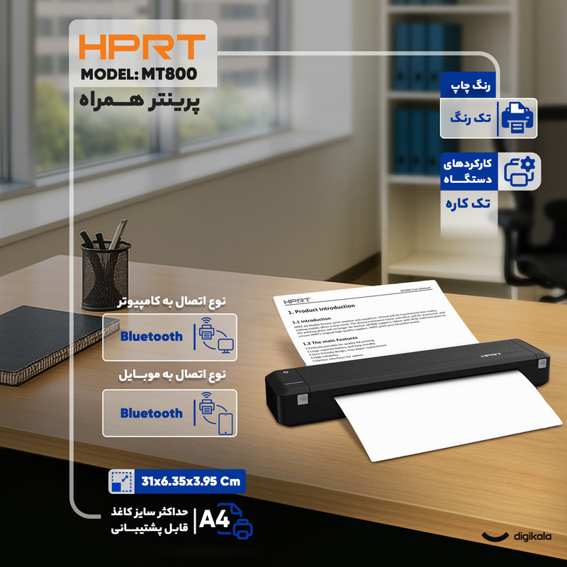 رابط اتصال Bluetooth 4.0 / درگاه ارتباطی USB Type-C (جهت شارژ باتری لیتیوم یونی) / حداکثر ابعاد کاغذ مورد پشتیبانی 8.3 در 11.7 اینچ / عرض چاپ ۱۹۸ میلیمتر / باتری لیتیومی قابل شارژ، ۲۰۰۰ میلیآمپر ساعت / مکش خودکار کاغذ / سرعت چاپ 15 میلیمتر بر ثانیه