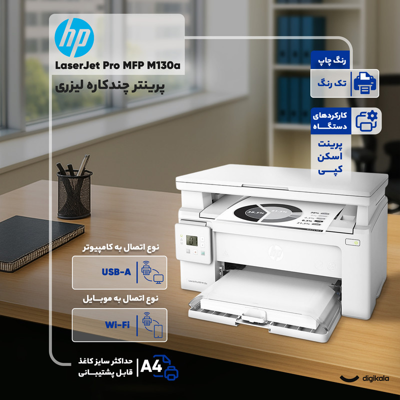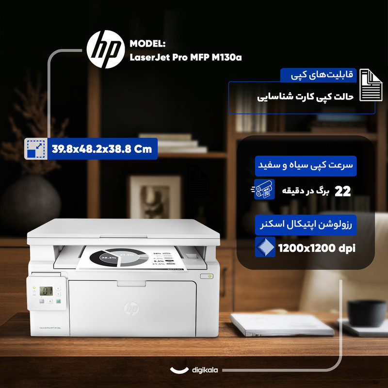 حداکثر ابعاد کاغذ مورد پشتیبانی 8.5 در 14 اینچ / حداکثر توان مصرفی 255 وات / دمای عملیاتی 17.5 تا 25 درجه سانتیگراد / میزان صدا 65 دسی بل (حالت فعال) / زبان پرینت PCLmS, URF, PWG / سرعت پردازنده تا 600 مگاهرتز