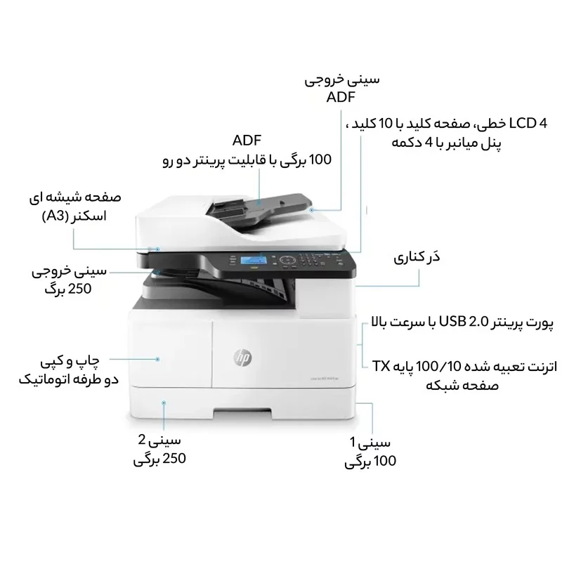 مدل: HP LaserJet MFP M443nda کد محصول: 8AF72A ابعاد: 505*583*560 میلیمتر وزن: 30 کیلوگرم تکنولوژی چاپ: چاپ لیزری کاربری: سهکاره سیاه و سفید نوع چاپ: تک رنگ سایز چاپ: A4 سرعت چاپ سیاه و سفید: 25 برگ در دقیقه سرعت چاپ دو رو: تا 13 برگ در دقیقه چاپ اولین صفحه: 7.7 ثانیه رزولوشن چاپ: تا 1200*1200 (dpi) توان کار ماهانه: حداکثر 50,000 صفحه، توصیهشده 2,000 تا 5,000 صفحه زبان چاپ: PS, PCL 6 قابلیت چاپ دو رو: دارد سایز کاغذ قابل استفاده: A3; A4; A5; A6; B4 (JIS); B5 (JIS); 8K; 16K; Oficio 216x340mm نوع کاغذ قابل استفاده: Plain, Mid-weight, Light, Coloured, Preprinted, Recycled, Intermediate, Prepunched وزن کاغذ قابل استفاده: 60 تا 163 (g/m²) ظرفیت سینی ورودی کاغذ: تا 350 برگ ظرفیت سینی خروجی کاغذ: تا 250 برگ اسکنر: دارد سرعت اسکن: تا 33 برگ در دقیقه رزولوشن اپتیکال اسکنر: تا 600*600 (dpi) حداکثر سایز اسکن: 297*432 میلیمتر Levels of grayscale: 256 عمق رنگ: 24 بیت کپی: دارد تنظیمات کپی: 600 x 600 dpi x 2 bit; Originals content settings: Text, Text/Photo, Photo, Map; Recuce/Enlarge scaling: 25 to 400% ; Copy qty settings: 1 to 999; Darkness controls: 11 levels (Light, Normal, Dark); Colation: Yes (Limited); N-up: A3: 2/4/8/16-up; A4: 2/4/8-up حداکثر تعداد کپی: تا 999 برگ بزرگنمایی کپی: 25 تا 400 درصد سرعت کپی: 25 برگ در دقیقه رزولوشن کپی: 600*600 (dpi) درگاه USB: پورت Hi-Speed USB 2.0 پورت شبکه Ethernet: Ethernet 10/100Base-TX شبکه بیسیم Wi-Fi: ندارد حافظه پرینتر: 512 مگابایت مشخصات منبع تغذیه: 220-240 ولت، 50 تا 60 هرتز توان مصرفی: 600 وات توان مصرفی در حالت Ready و sleep: 80 و 0.7 وات توان مصرفی در حالت auto-off/wake on USB: 0.2 وات محدوده رطوبت کاری: 20% تا 80% RH محدوده دمای کاری: 10 تا 30 درجه سانتیگراد محدوده دمای نگهداری: 20- تا 40 درجه سانتیگراد حداقل سیستم لازم برای ویندوز: CD-ROM or DVD drive, or Internet connection; Dedicated USB or network connection or Wireless connection; 200 MB available hard disk space; For OS hardware requirements see http://www.microsoft.com for Windows; Pentium IV 2.4GHz (Intel Core™2); RAM 512 MB (1 GB); Free available hard disk space 1 GB (2 GB) for Linux سازگار با سیستم عامل: Windows 7 (32/64-bit); Windows 2008 Server R2; Windows 8 (32/64-bit); Windows 8.1 (32/64-bit); Windows 10 (32/64-bit); Windows 2012 Server; Windows 2016 Server; Red Hat Enterprise Linux : 5, 6, 7; Fedora : 15, 16, 17, 18, 19, 20, 21, 22, 23, 24, 25, 26; openSUSE : 112, 11.4, 12.1, 121.2, 12.3, 13.1, 13.2, 42.1; Ubuntu : 11.10, 12.04, 12.10, 13.04, 13.10, 14.04, 14.10, 15.04, 15.10, 16.04, 16.10, 17.04, 17.10, 18.04, 18.10, 19.04; SUSE Linux Enterprise Desktop : 10, 11, 12; Debian : 6, 7, 8, 9; Linux Mint : 15, 16, 17, 18 سازگار با شبکه سیستمعامل: Windows OS compatible with In-Box Driver; Windows Server 2003/2003 R2 32-bit (SP1/SP2) Standard/Enterprise (+ Cluster & Terminal Services); Windows Server 2008 32/64-bit (SP2) Standard/Enterprise (+ Cluster & Terminal Services); Windows Server 2008 R2 64-bit (SP1) Standard/Enterprise (+ Cluster & Terminal Services); Windows OS compatible with Universal Print Driver (UPD) or Product-Specific drivers from http://www.hp.com; Windows Server 2003/2003 R2 32/64-bit (SP1/SP2) Standard/Enterprise/Datacenter (+ Cluster & Terminal Services); Windows Server 2008/2008 R2 32/64-bit (SP1/SP2) Standard/Enterprise/Datacenter (+ Cluster & Terminal Services); Windows Server 2012/2012 R2 64-bit Standard/Foundation/Essentials/Datacenter (+ Cluster & Terminal Services); Windows 8 (32/64-bit) recommend v5.86+, 8.1 recommend v5.94+; Windows 7 (32/64-bit) recommend v5.82+; Windows Vista (32/64-bit) recommend v5.82+; Windows XP/SP3 (32/64-bit) recommend v5.8