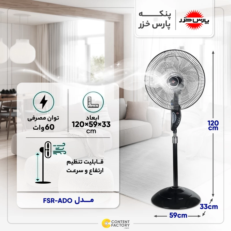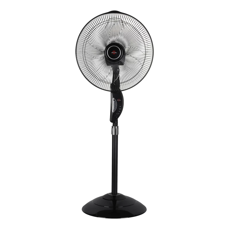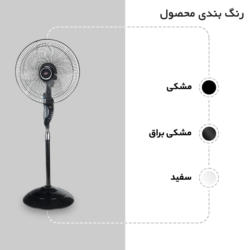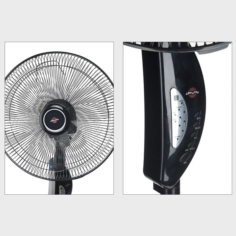 قابلیت تنظیم ارتفاع از 85 تا 115 سانتی متر و تنظیم گردش افقی، دارای تایمر 7.5 ساعته، گارد محافظ میله ای، ریموت کنترل، سیم 3 متری، حالت ریتم،