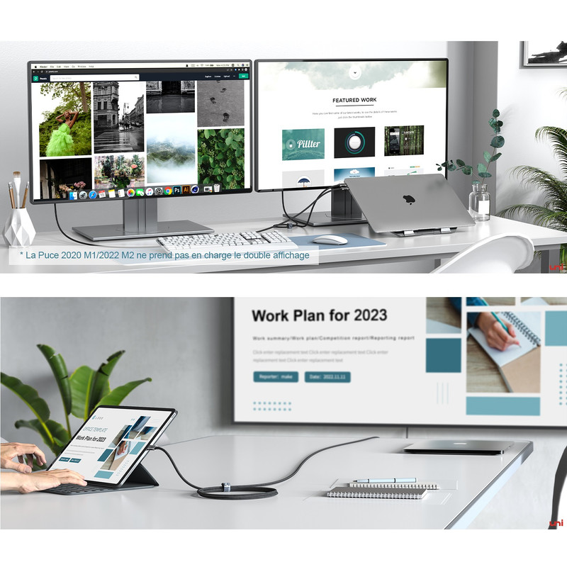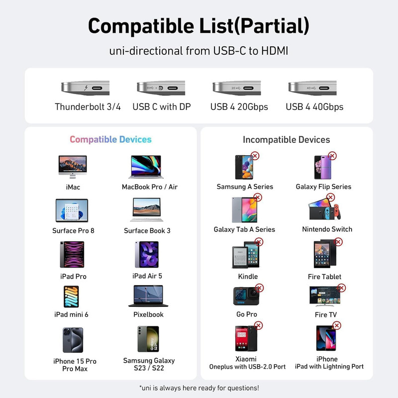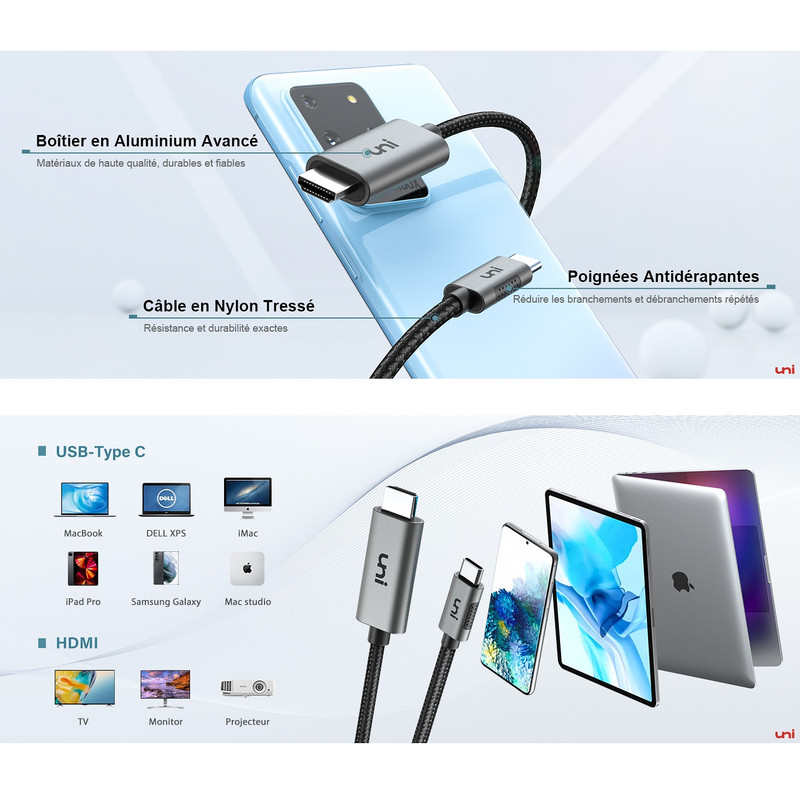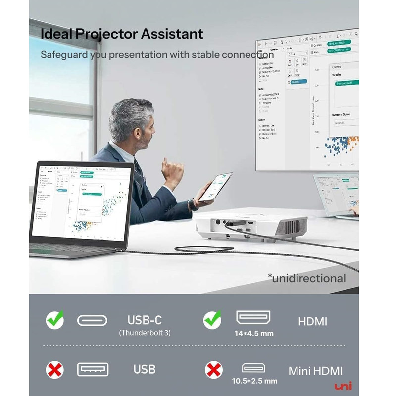 نرخ تازهسازی بالای ۶۰ هرتز: روانی صفحه نمایش با نرخ تازهسازی بالای ۶۰ هرتز دو برابر کابلهای ۳۰ هرتز دیگر است که میتواند لذت بصری بهتری را برای شما به ارمغان بیاورد. تصاویر صاف و بدون لرزش میتوانند از بینایی شما بهتر محافظت کنند. پخش از تلفن هوشمند : کابل uni USB C به HDMI میتواند به شما کمک کند تا مستقیماً از تلفن خود (پورت USB-C) به صفحه نمایش بزرگ منتقل کنید تا ورزش، فیلم، بازی و عکس/آلبوم تماشا کنید. حالت آینهای و حالت توسعهیافته پشتیبانی میشوند، بنابراین لازم نیست نگران مشکلات استریم وایفای با اتصال سیمی پایدار باشید. [سازگاری جهانی] این کابل Thunderbolt 3 HDMI USB C با مکبوک پرو (2016-تاکنون)، سری آیفون 15، آیپد پرو، مک مینی (2018-تاکنون)، آیمک (2017-تاکنون)، مکبوک (2015-تاکنون)، سرفیس بوک 2، پیکسلبوک، گلکسی بوک، گلکسی S10~S8/S8 Plus/S9 Plus/Note 8~Note 10، Dell XPS 15/XPS 13، کرومبوک، کرومبوک پیکسل، پیکسل اسلیت و غیره سازگار است (به بخش توضیحات دقیق محصول در زیر مراجعه کنید). طراحی قابل اعتماد و کاربرپسند:کابل نایلونی بافته شده برای دوام بیشتر و طراحی ضد لغزش کاربرپسند برای اتصال و جدا کردن آسانتر. محفظه آلیاژ آلومینیوم مرغوب برای عایق حرارتی بهتر. کاملاً با پورتهای USB-C دستگاههای شما سازگار است تا انتقال سیگنال پایدار باشد.