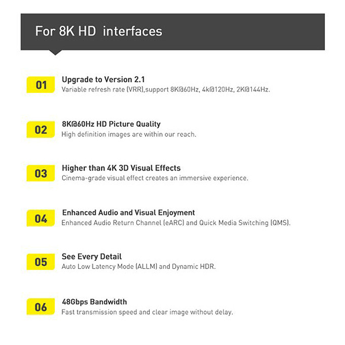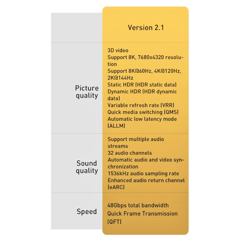 طول کابل: 1 متر نسخه HDMI 2.1 پهنای باند 48Gbps رزولوشن: 4320×7680 پشتیبانی از HDR دینامیک انتقال تصویر با کیفیت 8K@60Hz پشتیبانی از قابلیتهای VRR (نرخ رفرش متغیر)، QMS (جابهجایی سریع مدیا)، ALLM (حالت تاخیر پاین خودکار) و eARC (کانال تقویت شده بازگشت صدا)