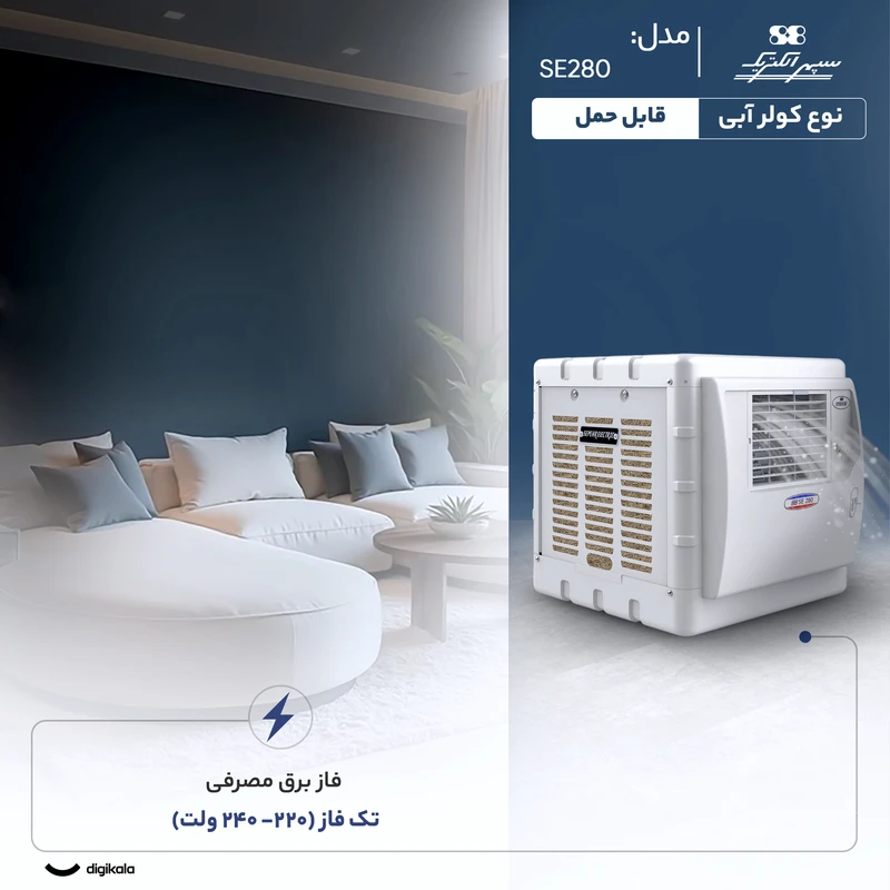کولر آبی SE280 از برند معتبر سپهر الکتریک با توان مصرفی 1.8 اسب بخار، برای فضاهایی تا حدود ۴۰ متر مربع طراحی شده است. این کولرآبی جمع و جور در مقایسه با قیمت کولر آبی برندهای دیگر، با موتور الکتروژن درجه یک ایرانی کار می‌کند و دارای راندمان خنک‌کنندگی بالا و مصرف برق بسیار پایین‌تری نسبت به کولرهای گازی است.