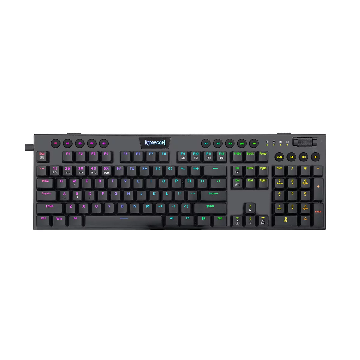 دارای 5 کلید مدیا برای تنظیم صدا، پخش/ توقف، قطع/ وصل، قبلی، بعدی، غیرفعال سازی کلید Win، دکمه پاور، کلیدهای اختصاصی ماکرو