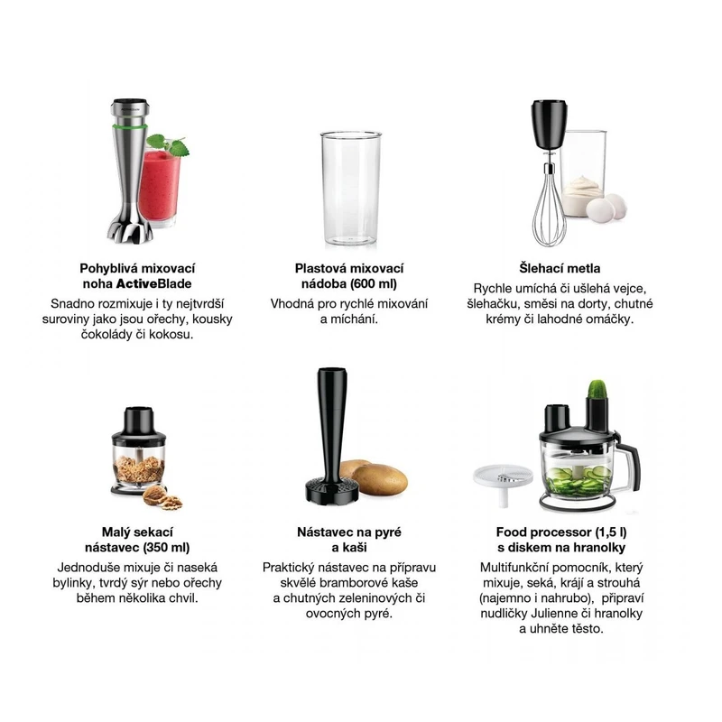 دارای پایه پوره کن، همزن فنری نرم جهت تهیه سس و خامه و …..، دارای پره خمیرزن، پایه گوشت کوب از جنس استیل ضد زنگ و ضد پاشش مواد غذایی
