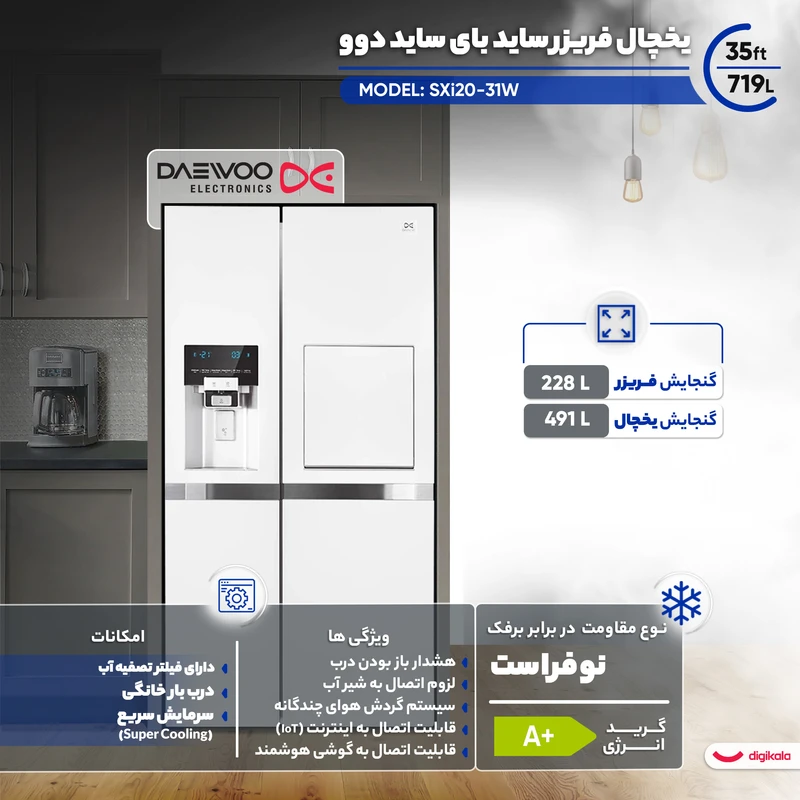مشخصات فنی یخچال فریزر ساید بای ساید 35 فوت دوو مدل SXi20-31W